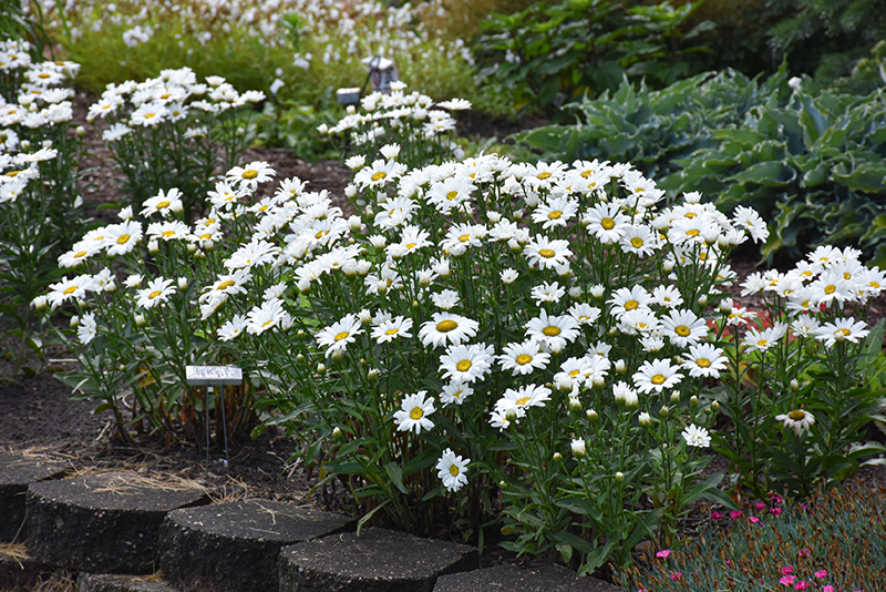 Hardiness Zone: 4 Group/Class: Amazing Daisies Collection Brand: Proven Winners Description: A delightful variety of the ever-popular shasta daisy; numerous beautiful white double blooms with yellow eyes rise above and graciously contrast the deep green glossy foliage; a wonderful choice to mass as a garden focal point Ornamental Features Daisy May® Shasta Daisy has masses of beautiful double white daisy flowers with yellow eyes at the ends of the stems from early to late summer, which are most effective when planted in groupings. The flowers are excellent for cutting. Its serrated narrow leaves remain dark green in color throughout the season. Landscape Attributes Daisy May® Shasta Daisy is an herbaceous perennial with an upright spreading habit of growth. Its medium texture blends into the garden, but can always be balanced by a couple of finer or coarser plants for an effective composition. This plant will require occasional maintenance and upkeep, and should be cut back in late fall in preparation for winter. It is a good choice for attracting butterflies to your yard. Gardeners should be aware of the following characteristic(s) that may warrant special consideration; Daisy May® Shasta Daisy is recommended for the following landscape applications; Planting & Growing Daisy May® Shasta Daisy will grow to be about 22 inches tall at maturity, with a spread of 24 inches. When grown in masses or used as a bedding plant, individual plants should be spaced approximately 20 inches apart. The flower stalks can be weak and so it may require staking in exposed sites or excessively rich soils. It grows at a fast rate, and under ideal conditions can be expected to live for approximately 5 years. As an herbaceous perennial, this plant will usually die back to the crown each winter, and will regrow from the base each spring. Be careful not to disturb the crown in late winter when it may not be readily seen! This plant does best in full sun to partial shade. It does best in average to evenly moist conditions, but will not tolerate standing water. It is not particular as to soil type or pH. It is highly tolerant of urban pollution and will even thrive in inner city environments. This particular variety is an interspecific hybrid. It can be propagated by division; however, as a cultivated variety, be aware that it may be subject to certain restrictions or prohibitions on propagation. Daisy May® Shasta Daisy is a fine choice for the garden, but it is also a good selection for planting in outdoor pots and containers. With its upright habit of growth, it is best suited for use as a 'thriller' in the 'spiller-thriller-filler' container combination; plant it near the center of the pot, surrounded by smaller plants and those that spill over the edges. It is even sizeable enough that it can be grown alone in a suitable container. Note that when growing plants in outdoor containers and baskets, they may require more frequent waterings than they would in the yard or garden.![]()