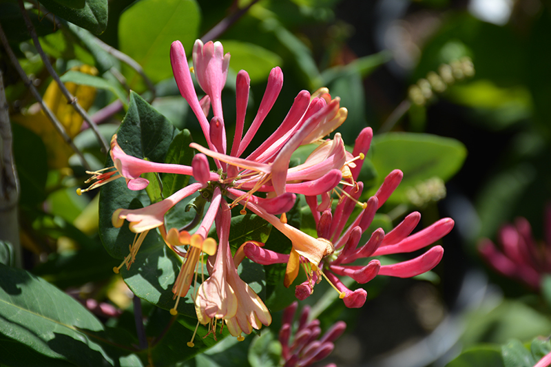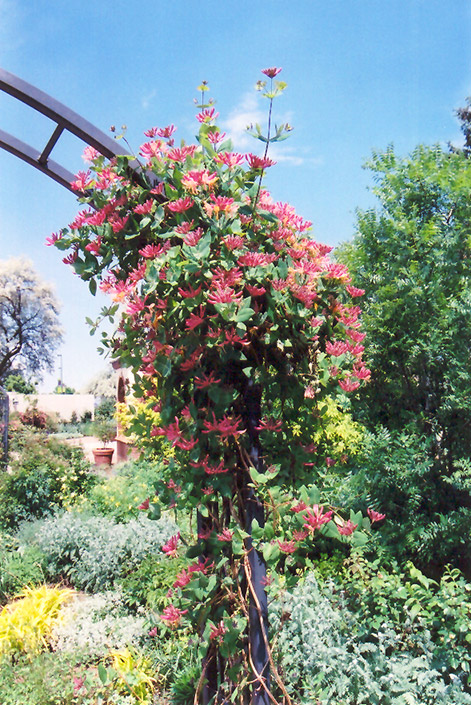 Hardiness Zone: 5 Other Names: Everblooming Honeysuckle Description: A very popular vine valued for its exceptionally colorful pinkish-red tubular flowers which are produced over a very long period; very easy to grow and not excessively aggressive, a great choice for arbors and trellises Ornamental Features Goldflame Honeysuckle features showy clusters of fragrant shell pink trumpet-shaped flowers with yellow overtones and pink edges at the ends of the branches from early to mid spring, which emerge from distinctive cherry red flower buds. It has bluish-green deciduous foliage which emerges burgundy in spring. The oval leaves do not develop any appreciable fall color. However, the fruit can be messy in the landscape and may require occasional clean-up. Landscape Attributes Goldflame Honeysuckle is a multi-stemmed deciduous woody vine with a twining and trailing habit of growth. Its average texture blends into the landscape, but can be balanced by one or two finer or coarser trees or shrubs for an effective composition. This woody vine will require occasional maintenance and upkeep, and is best pruned in late winter once the threat of extreme cold has passed. It is a good choice for attracting butterflies and hummingbirds to your yard. It has no significant negative characteristics. Goldflame Honeysuckle is recommended for the following landscape applications; Planting & Growing Goldflame Honeysuckle will grow to be about 20 feet tall at maturity, with a spread of 24 inches. As a climbing vine, it tends to be leggy near the base and should be underplanted with low-growing facer plants. It should be planted near a fence, trellis or other landscape structure where it can be trained to grow upwards on it, or allowed to trail off a retaining wall or slope. It grows at a fast rate, and under ideal conditions can be expected to live for approximately 20 years. This woody vine should only be grown in full sunlight. It does best in average to evenly moist conditions, but will not tolerate standing water. It is not particular as to soil type or pH. It is somewhat tolerant of urban pollution. Consider applying a thick mulch around the root zone in winter to protect it in exposed locations or colder microclimates. This particular variety is an interspecific hybrid.