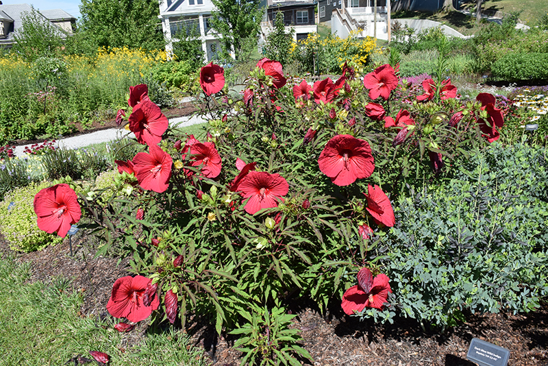 Hardiness Zone: 4 Other Names: Rose Mallow, Hardy Hibiscus Description: This bold garden perennial features very showy red flowers and dark-red eye and finely cut, dark-green leaves with burgundy markings; ideal for the mixed garden border or in mass; do not allow to dry to wilting point Ornamental Features Fireball Hibiscus features bold red round flowers with dark red eyes at the ends of the stems from mid summer to early fall. Its attractive large deeply cut narrow leaves remain green in color with distinctive deep purple veins throughout the season. Landscape Attributes Fireball Hibiscus is an herbaceous perennial with an upright spreading habit of growth. Its relatively fine texture sets it apart from other garden plants with less refined foliage. This plant will require occasional maintenance and upkeep, and should be cut back in late fall in preparation for winter. It is a good choice for attracting butterflies and hummingbirds to your yard. Gardeners should be aware of the following characteristic(s) that may warrant special consideration; Fireball Hibiscus is recommended for the following landscape applications; Planting & Growing Fireball Hibiscus will grow to be about 4 feet tall at maturity, with a spread of 4 feet. When grown in masses or used as a bedding plant, individual plants should be spaced approximately 3 feet apart. It grows at a fast rate, and under ideal conditions can be expected to live for approximately 5 years. As an herbaceous perennial, this plant will usually die back to the crown each winter, and will regrow from the base each spring. Be careful not to disturb the crown in late winter when it may not be readily seen! This plant does best in full sun to partial shade. It requires an evenly moist well-drained soil for optimal growth, but will die in standing water. It is not particular as to soil type or pH. It is highly tolerant of urban pollution and will even thrive in inner city environments. Consider applying a thick mulch around the root zone in winter to protect it in exposed locations or colder microclimates. This particular variety is an interspecific hybrid. It can be propagated by cuttings; however, as a cultivated variety, be aware that it may be subject to certain restrictions or prohibitions on propagation.