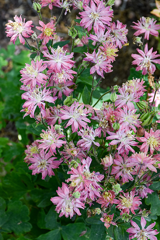 Hardiness Zone: 2 Other Names: Granny's Bonnet, Crowfoot Description: A unique variation of Colombine, featuring fluffy double flowers that resemble a small Clematis bloom, held up facing on stems, well above the lacy green foliage mound; flowers will range from dusty rose to salmon; seedlings may not resemble mother plant Ornamental Features Clematis-Flowered Columbine features showy double salmon bell-shaped flowers with rose tips rising above the foliage from late spring to early summer, which emerge from distinctive creamy white flower buds. The flowers are excellent for cutting. Its lobed compound leaves remain green in color throughout the season. Landscape Attributes Clematis-Flowered Columbine is an herbaceous perennial with an upright spreading habit of growth. Its relatively fine texture sets it apart from other garden plants with less refined foliage. This is a relatively low maintenance plant, and should be cut back in late fall in preparation for winter. Deer don't particularly care for this plant and will usually leave it alone in favor of tastier treats. Gardeners should be aware of the following characteristic(s) that may warrant special consideration; Clematis-Flowered Columbine is recommended for the following landscape applications; Planting & Growing Clematis-Flowered Columbine will grow to be about 12 inches tall at maturity extending to 18 inches tall with the flowers, with a spread of 12 inches. Its foliage tends to remain dense right to the ground, not requiring facer plants in front. It grows at a fast rate, and under ideal conditions can be expected to live for approximately 5 years. As an herbaceous perennial, this plant will usually die back to the crown each winter, and will regrow from the base each spring. Be careful not to disturb the crown in late winter when it may not be readily seen! This plant does best in full sun to partial shade. It does best in average to evenly moist conditions, but will not tolerate standing water. It is not particular as to soil type or pH. It is somewhat tolerant of urban pollution. This is a selected variety of a species not originally from North America. Clematis-Flowered Columbine is a fine choice for the garden, but it is also a good selection for planting in outdoor pots and containers. It is often used as a 'filler' in the 'spiller-thriller-filler' container combination, providing a mass of flowers against which the larger thriller plants stand out. Note that when growing plants in outdoor containers and baskets, they may require more frequent waterings than they would in the yard or garden.![]()
