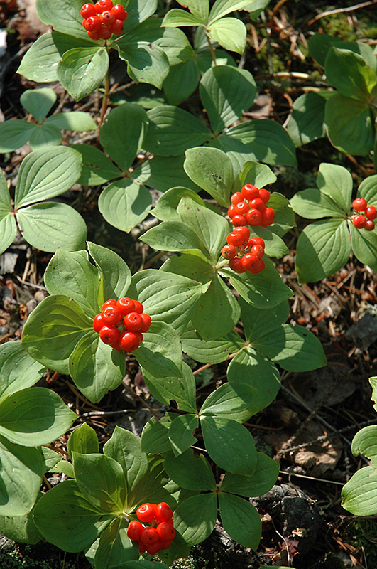 Hardiness Zone: 1 Other Names: Creeping Dogwood Description: One of the more refined hardy groundcovers, with incredible white flowers in spring and red berries in fall; very particular about its siting, needs moist, well-drained organic and acidic soil and shade; stunning when happy Ornamental Features Bunchberry has creamy white star-shaped flowers with white bracts at the ends of the branches from late spring to early summer, which are interesting on close inspection. The red fruits are held in abundance in spectacular clusters from mid summer to early fall. It has dark green evergreen foliage. The pointy leaves turn an outstanding brick red in the fall, which persists throughout the winter. Landscape Attributes Bunchberry is a spreading evergreen shrub with a ground-hugging habit of growth. Its relatively fine texture sets it apart from other landscape plants with less refined foliage. This shrub will require occasional maintenance and upkeep, and should never be pruned except to remove any dieback, as it tends not to take pruning well. It is a good choice for attracting birds to your yard, but is not particularly attractive to deer who tend to leave it alone in favor of tastier treats. It has no significant negative characteristics. Bunchberry is recommended for the following landscape applications; Planting & Growing Bunchberry will grow to be about 8 inches tall at maturity, with a spread of 24 inches. It tends to fill out right to the ground and therefore doesn't necessarily require facer plants in front. It grows at a slow rate, and under ideal conditions can be expected to live for approximately 20 years. This shrub performs well in both full sun and full shade. It requires an evenly moist well-drained soil for optimal growth, but will die in standing water. It is particular about its soil conditions, with a strong preference for rich, acidic soils. It is quite intolerant of urban pollution, therefore inner city or urban streetside plantings are best avoided, and will benefit from being planted in a relatively sheltered location. Consider covering it with a thick layer of mulch in winter to protect it in exposed locations or colder microclimates. This species is native to parts of North America.